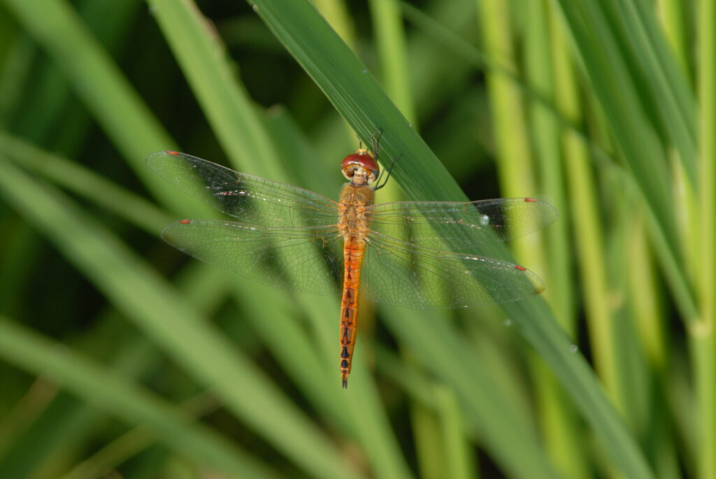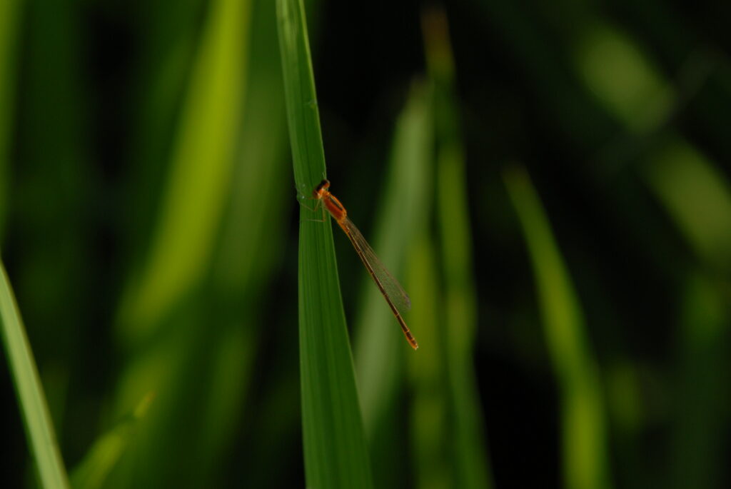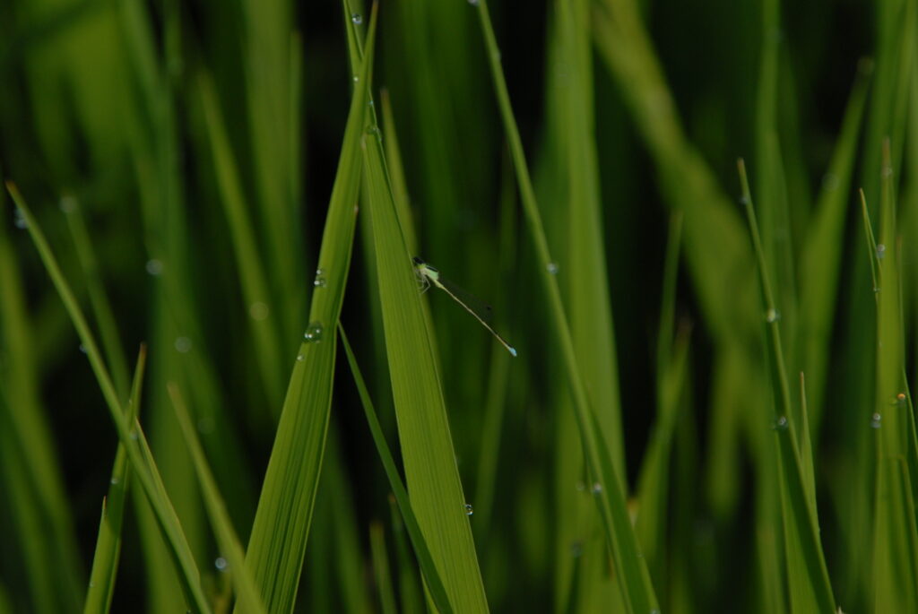 私の田んぼは、イトトンボや赤とんぼ、カエルたちが安心して卵を産みに来る、 生命力あふれる場所です。 一般的な田んぼよりもずっと広く、坪28株というゆったりとした間隔で植えた稲たちは、 太陽の光を全身に浴びて、健康でたくましく育ちました。