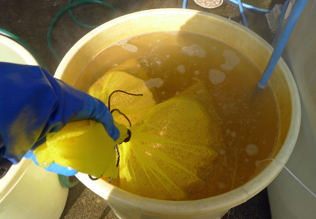 午前中は酒井ファームさんにお邪魔して、種もみの「温湯(おんとう)消毒」です。 農薬を使わない私の米作りでは、このお湯での消毒が欠かせません。 60℃のお湯に10分間。私の分10kgと酒井さんの分60kg、合わせて70kgを約2時間かけてじっくり消毒しました。
