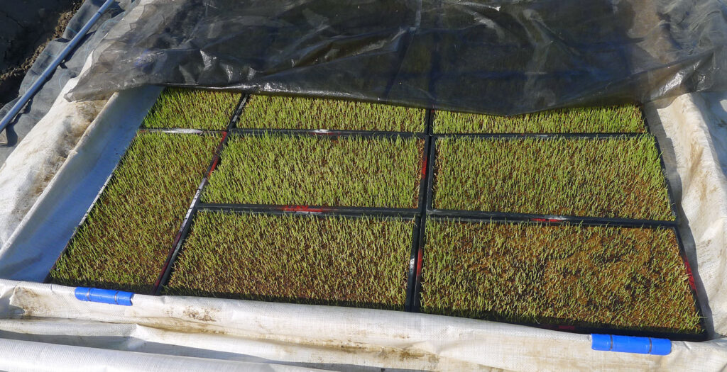 【苗の日光浴】路地プール育苗、太陽の光を全身に浴びて。